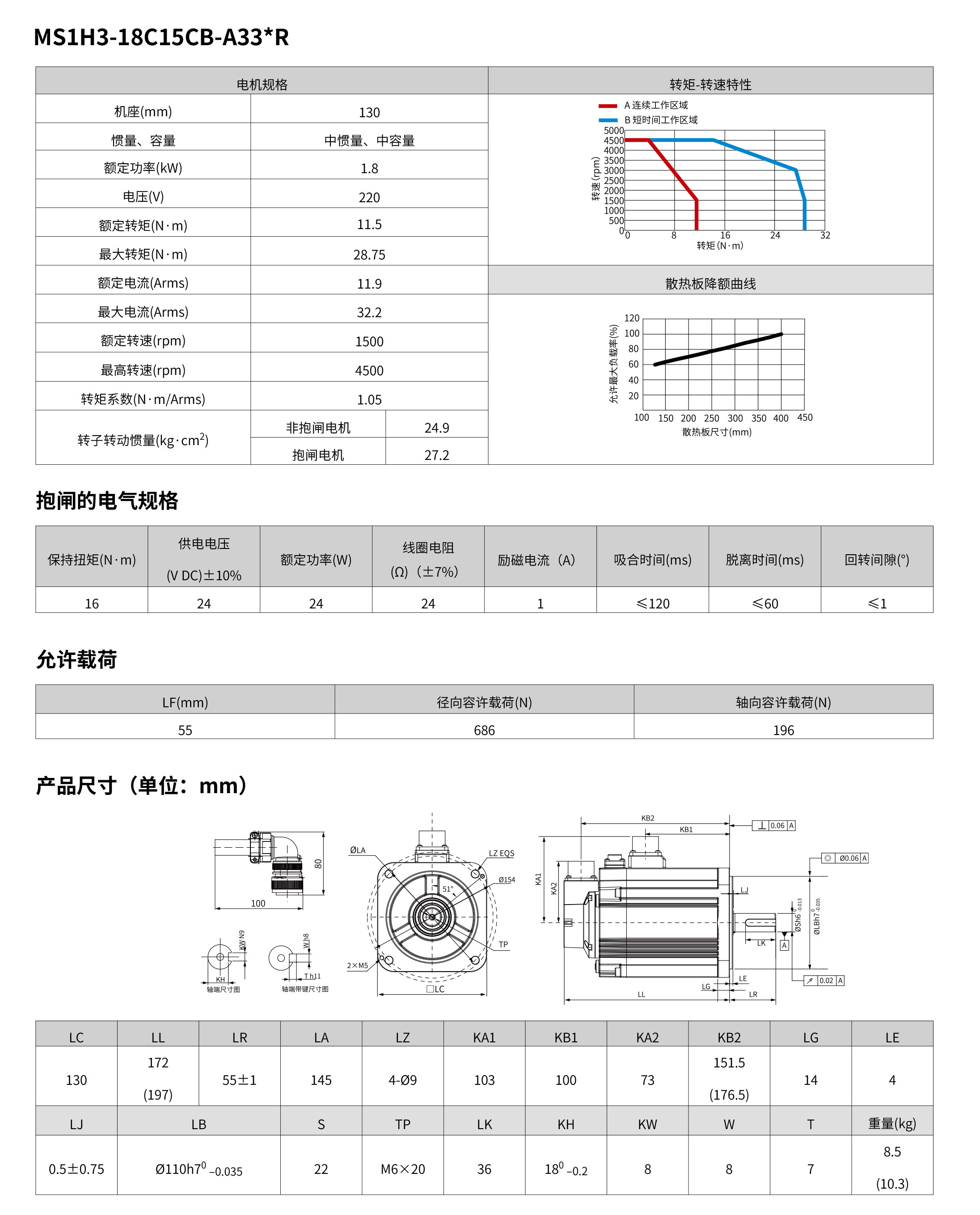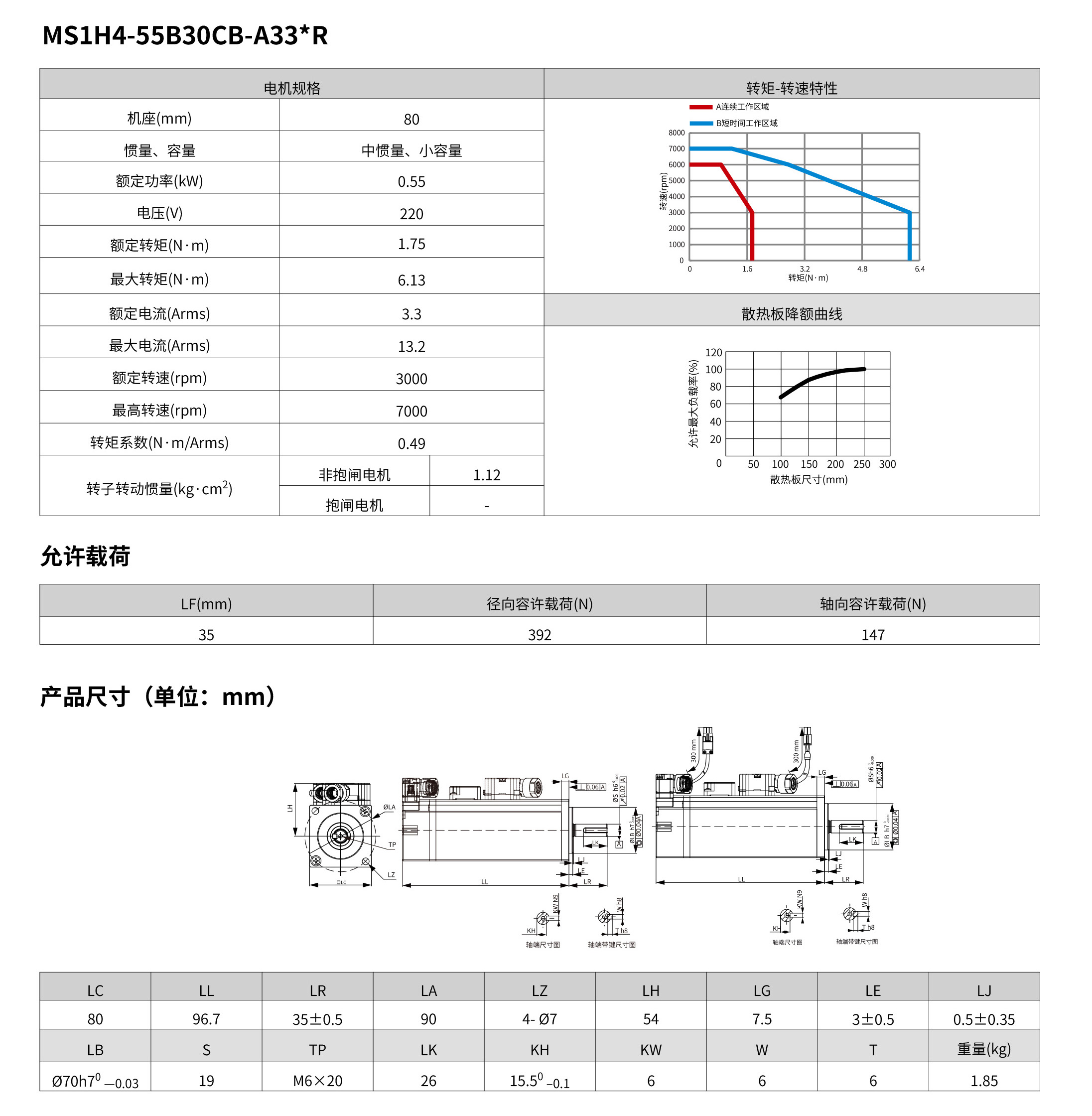 • 更高转速:MS1H1 和 MS1H4 (40/60/80 机座 ) 最高转速从 6000rpm 提升到  7000rpm;MS1H2 机型最高转速从 5000rpm 提升到 6000rpm;MS1H3(130/180  机座)最高转速从 3000rpm 提升到 4500rpm(说明:带 26 位 &23 位编码器机型)